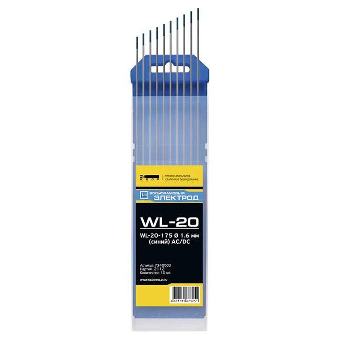 Электрод вольфрамовый WL-20 Ø1,6 (Синий) КЕДР отличается облегчённым первичным запуском дуги, а также он не склонен к прожогам. Дуга данного электрода обладает высокой устойчивостью и хорошей характеристикой вторичного зажигания.