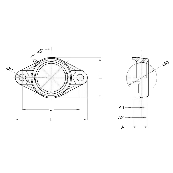 Данный корпус относится к фланцевому типу. Монтаж на рабочую поверхность осуществляется стопорными винтами. Материал изготовления — нержавеющая сталь AISI 304. Подходит для работы при температуре до +350°С.