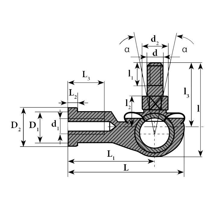 Угловой шарнирный наконечник SQ6CRS ISB изготовлен из оцинкованной стали и способен проворачиваться до 25 градусов вокруг оси. Имеет внутреннюю и наружную резьбу. Снижение трения происходит за счет тканевой PTFE-прокладки в паре трения сталь/спеченная бронза.