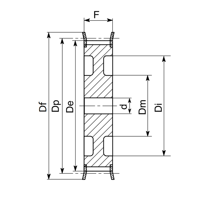 Имеет ступицу для доработки под посадку на вал или другую часть трансмиссии и черновое отверстие под расточку под требуемый диаметр отверстия.