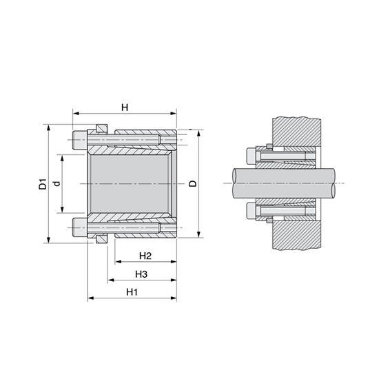 Наружный диаметр втулки составляет 130 мм, внутренний — 90 мм. Имеет 4 винта для слабых нагрузок и 10 для сильных. Передаваемая осевая сила равна 156 кН, а усилие затяжки винта — 83 Н*м. Корпус изготавливается из стали, отличается высокой прочностью и долговечностью.